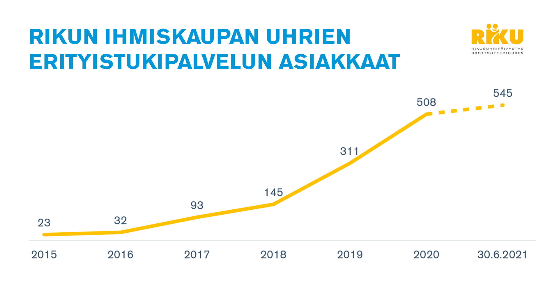 Tammi-kesäkuussa 2021 Rikosuhripäivystyksen (RIKU) ihmiskaupan ja sen lähirikosten uhrien auttamistyön piiriin tuli 98 uutta asiakasta. Kesäkuun lopussa erityistukipalvelun asiakkaana oli yhteensä 545 ihmiskaupan tai lähirikoksen uhria. Lukuun sisältyvät aikaisimpina vuosina asiakkaaksi tulleet ja vielä asiakkaana olevat.