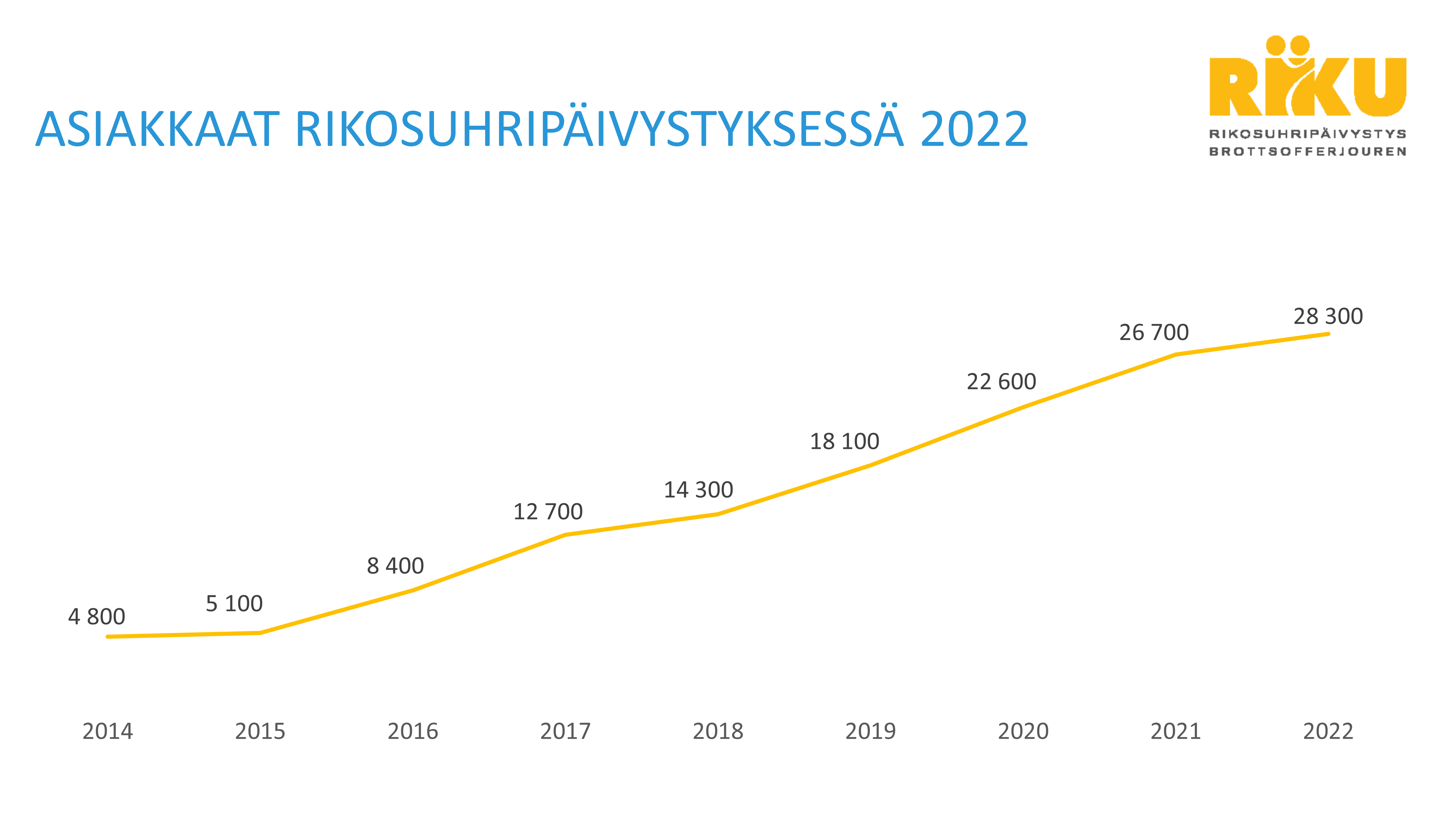 - Asiakkaista 6800 oli tullut Rikosuhripäivystykseen poliisin ohjaamana, mikä on 15 prosenttia enemmän kuin vuonna 2021.