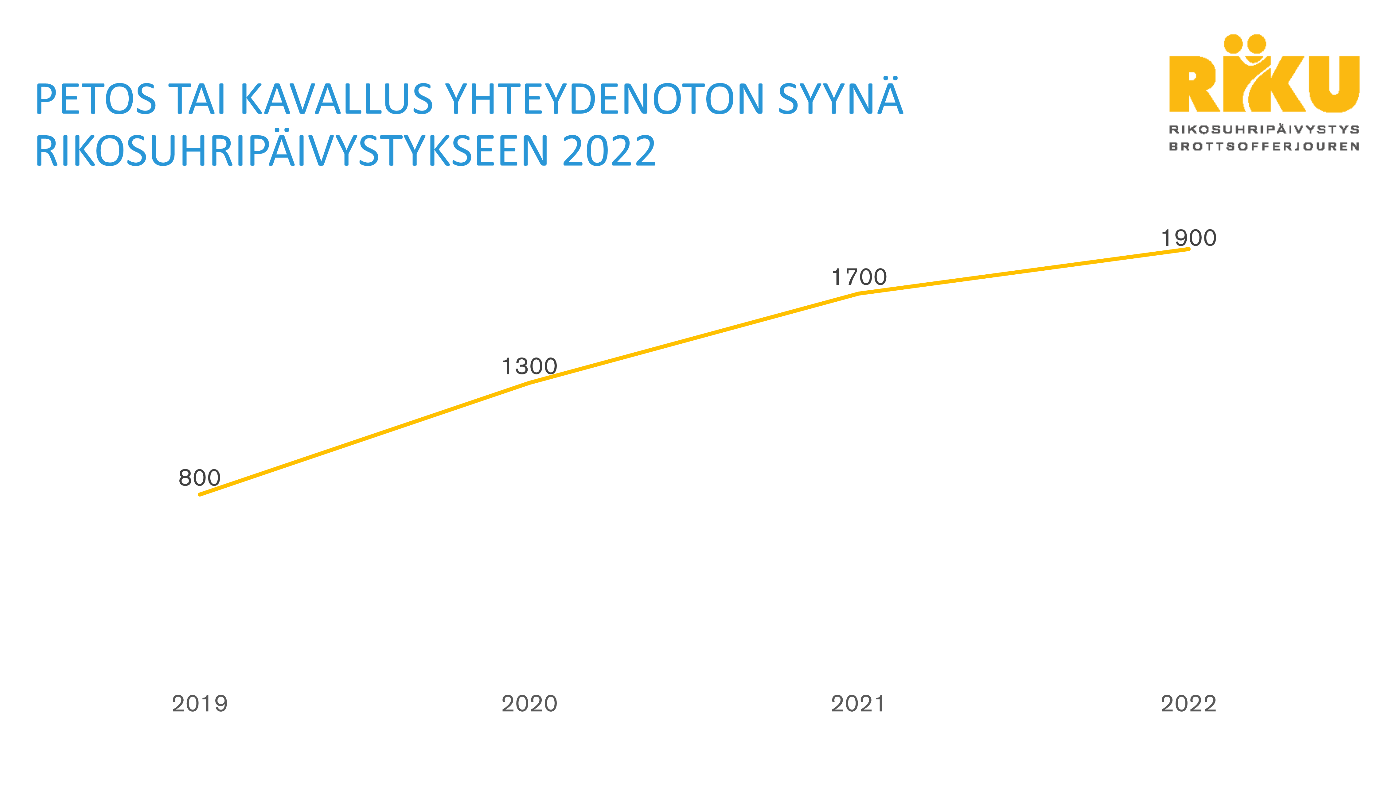 Erilaisten petosrikosten yleistyminen näkyy Rikosuhripäivystyksessä. RIKUn eri palveluissa on ollut vuonna 2022 yhteydenoton syynä petos tai kavallus noin 1900 tapauksessa. Näistä petoksia on ollut valtaosa. Vuonna 2021 vastaava määrä oli 1700. Tähän on laskettu voimassa olevat pitkäkestoisemmat asiakassuhteet ja yksittäiset yhteydenotot eri palveluihin.