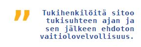 Maria jatkaa, että tukihenkilöitä sitoo koko tukisuhteen ajan ja sen jälkeen asiakasta koskeva ehdoton vaitiolovelvollisuus.