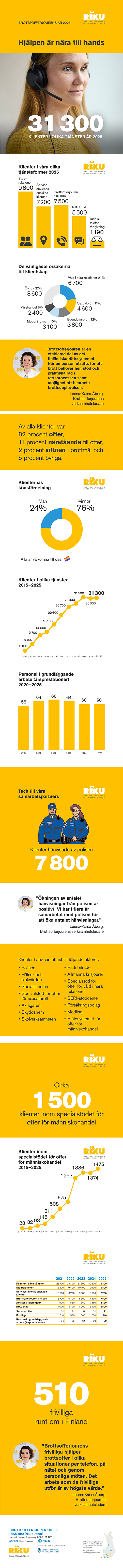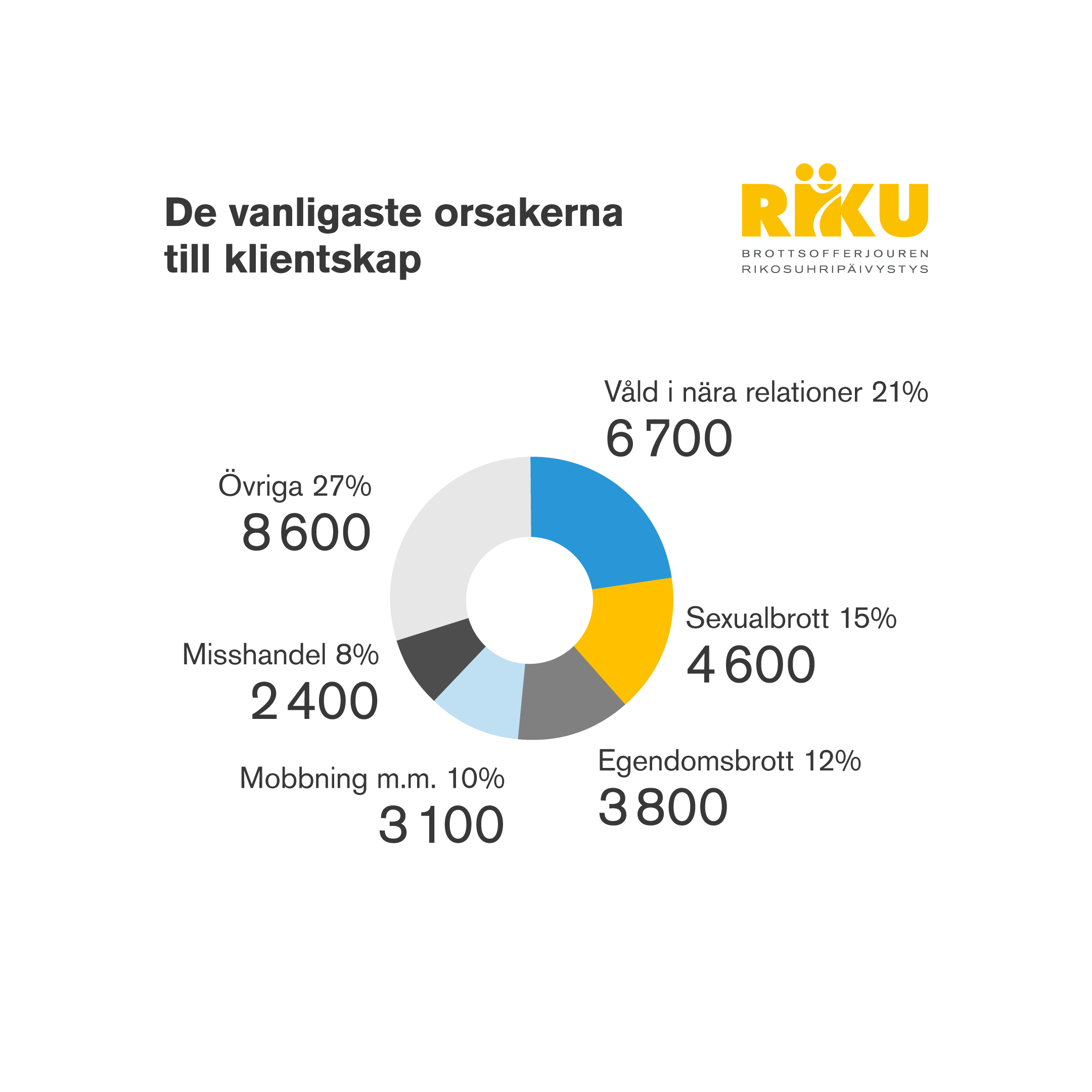 RIKU stöder och vägleder alla brottsoffer, deras närstående och vittnen i brottmål. Ökningen i det totala antalet klienter förklaras inte av en enskild grupp, utan syns i flera olika brottstyper.