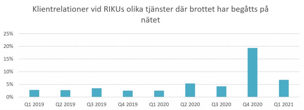 Under det första kvartalet i år begicks 7 procent av alla brott bland RIKUs klienter på nätet. År 2020 var andelen 3 procent under samma period. Befintliga långvariga klientförhållanden och enskilda kontakter till olika tjänster har inkluderats i dessa.